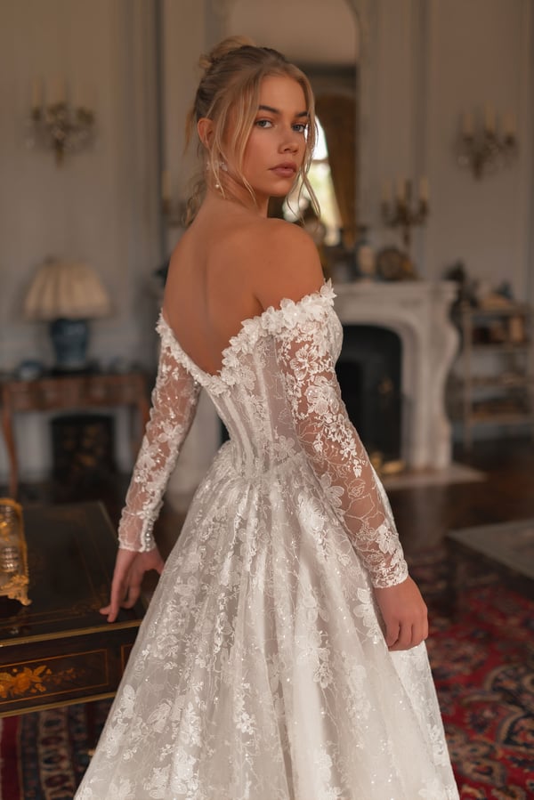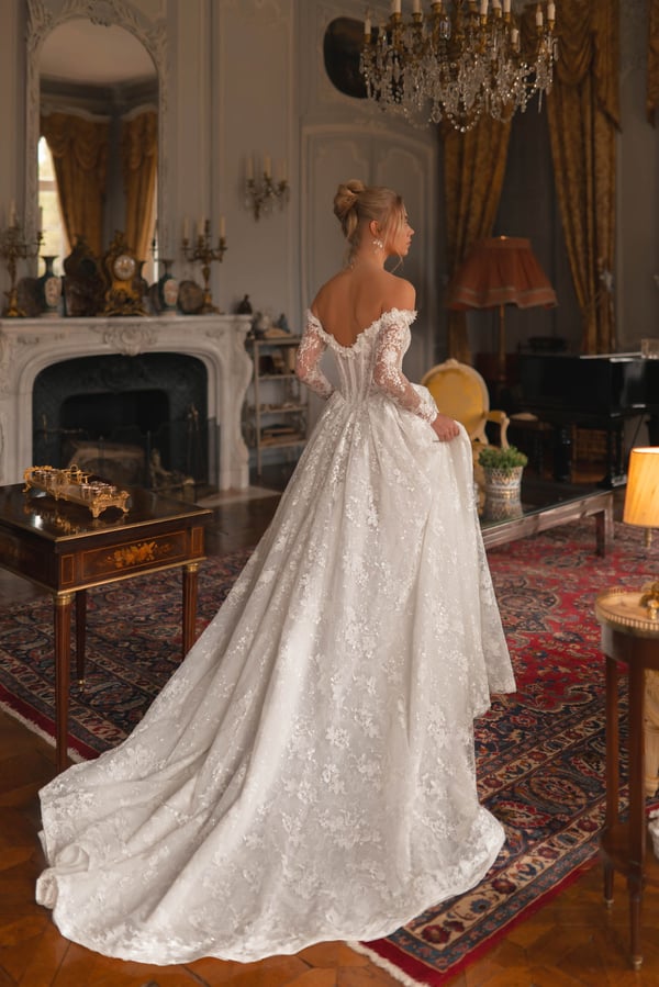 At first glance, the classic long-sleeved dress combines three trends: a straight neckline, lowered shoulders, and a low waist in the center of the corset. The dress is lightweight, the skirt is airy and has a train created for the perfect bride's entrance at the ceremony and the dance part of the banquet. The top of the dress is covered with delicate guipure with floral patterns, which are embroidered with transparent sequins of different sizes for radiance. The neckline is decorated with voluminous handmade flowers embroidered with sparkling beads.