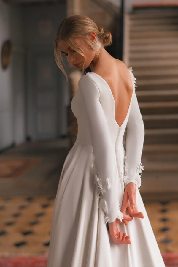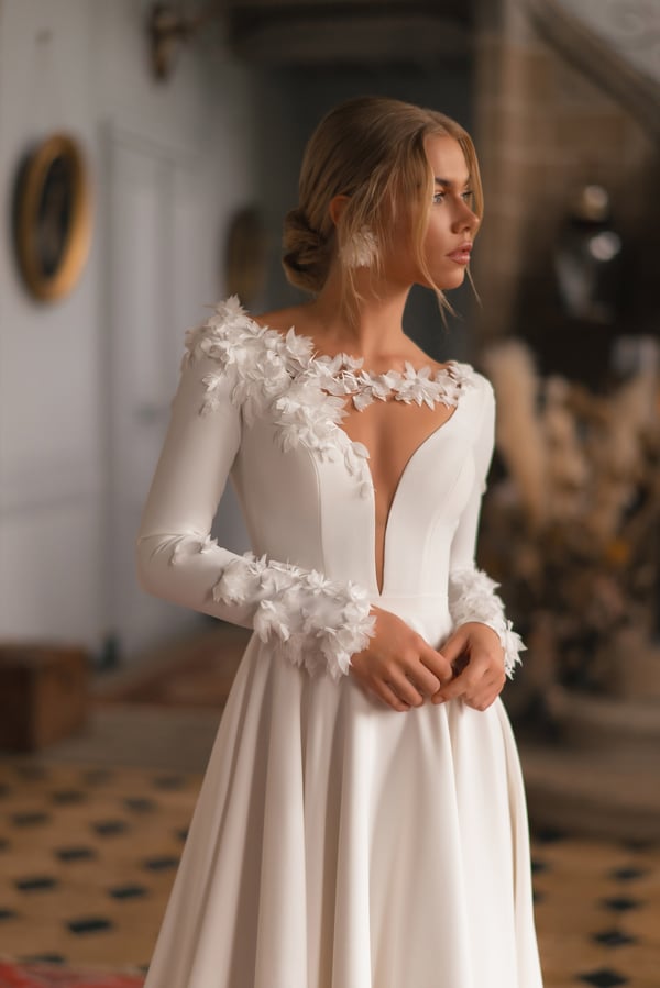 The Margo A-line dress is designed for brides who want to complement the minimalist style with romantic notes. The laconic high-quality crepe fits incredibly well and falls in soft lines down the skirt. The low neckline to the waist is covered with transparent mesh, and the back has a V-neck and a zipper with a row of functional buttons covered with fabric. The waist is emphasized by a decorative sewn-in belt. The long sleeves and neckline are asymmetrically embroidered with 3D flowers.