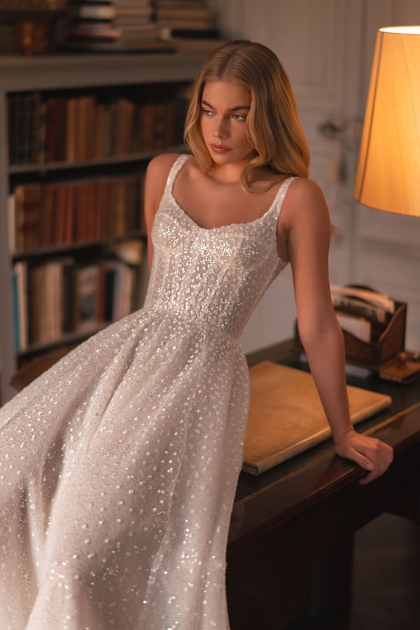 The Wiki A-line dress radiates an unsurpassed glow. It is made of guipure with embroidered polka dots and is completely covered with sequins of different diameters. The top has one-piece straps, a smooth neckline, a U-shaped back, and visible corset lines. The skirt is lightweight, multi-layered, slightly translucent, and has a train.