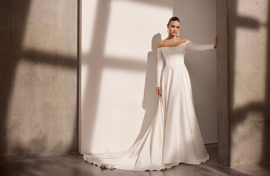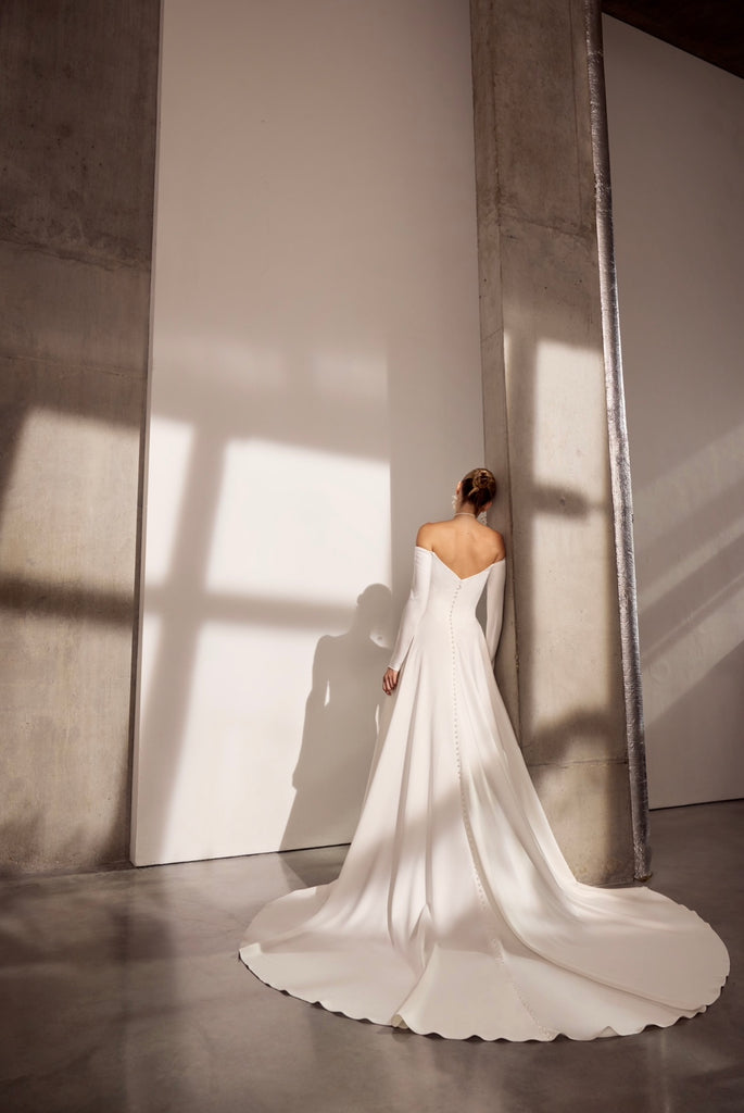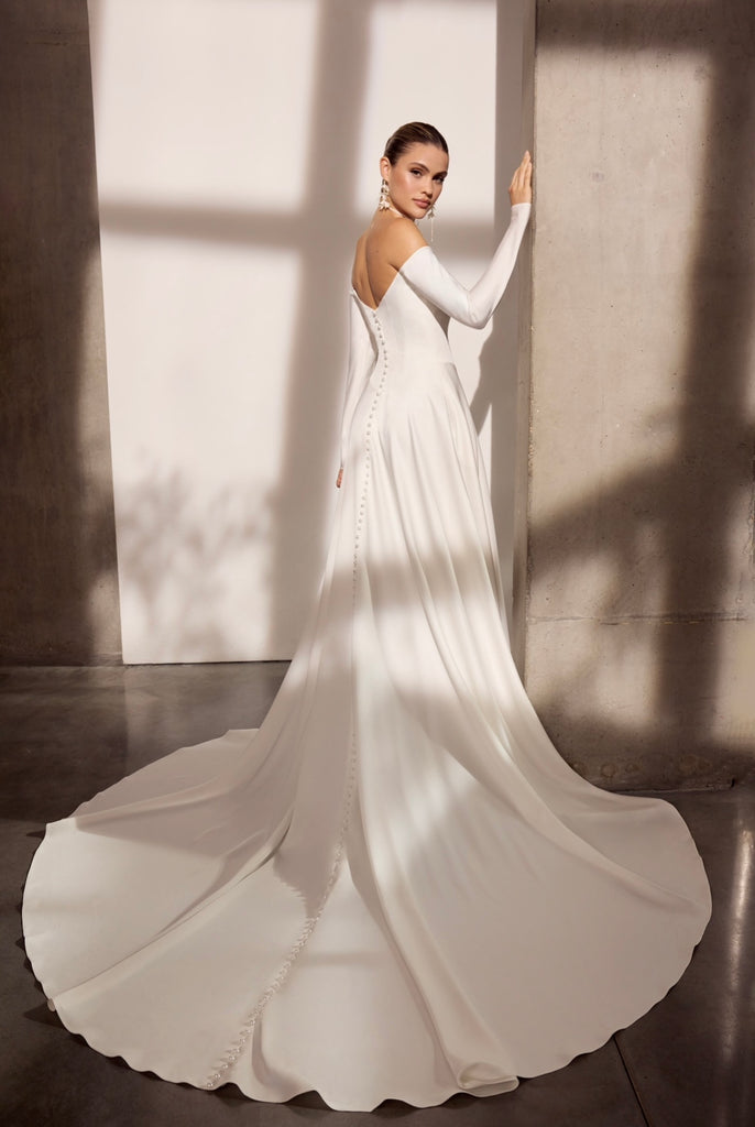 Introducing MADDISON, a clean, timeless slim A-line gown that epitomizes elegance and sophistication. With a flattering off-the-shoulder neckline and sleeves, MADDISON is crafted from luxurious Japanese satin crepe, ensuring a smooth, refined silhouette that hugs every curve. The basque waistline accentuates your figure, while the delicate covered buttons add a touch of classic charm.