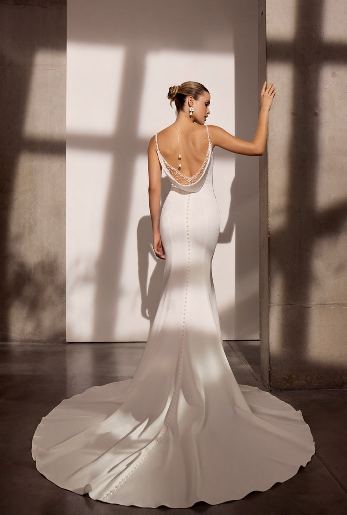 Discover elegance with PEARLA, a wedding dress that epitomizes modern sophistication. Featuring a modern silhouette with draped basque waistline in luxurious Japanese satin crepe, this design offers a seamless blend of tradition and contemporary style. The striking modern pearl neckline adds an exquisite touch, while the dramatic back, highlighted by a detachable cowl-neck and pearl buttons extending into the train, creates an unforgettable statement.