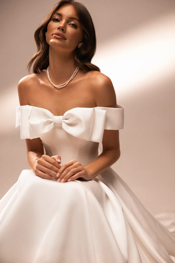 A-line jacquard Nana dress is worthy of a royal wedding. A gown combines minimalism and classics at the same time, creating a flawless image. The main emphasis is on the off-the-shoulder neckline, the straps of which are tied behind in long ribbons. A straight cut in front is decorated with a bow.