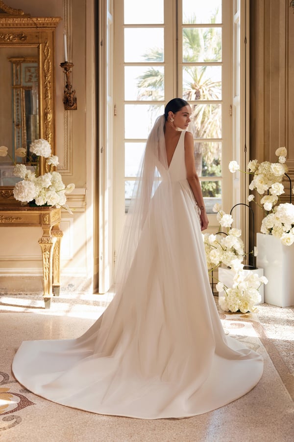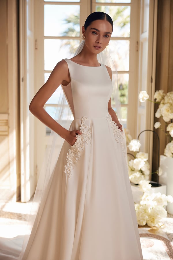 The Zara A-line dress is worthy of a luxurious royal wedding. It is made of satin and features a boat neckline, transparent inserts on the sides, and an open back. For the bride's convenience, the designer created pockets adorned with voluminous handmade satin flowers. The look is completed with a classic long veil.