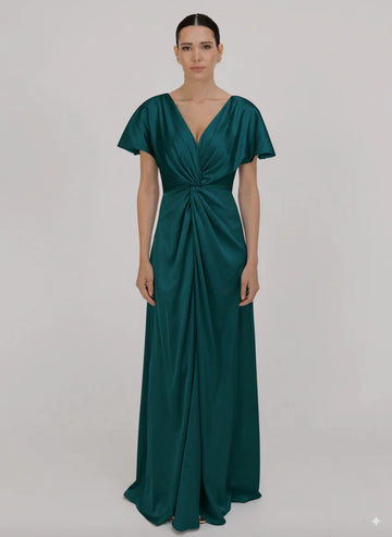 Camilla gown has been tailored to ensure it accentuates your figure at every angle. This stretch satin dress has a bodice with twisted knot detailing with a A-line skirt that falls elegantly to the floor. Complimented with a flattering sleeve and keyhole back detail that enables a bra to be worn.