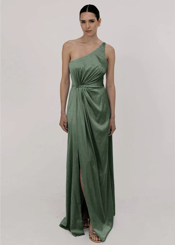 Greta gown delivers indisputable glamour. Crafted from swathes of our luxurious signature satin, it has a sweeping one-shoulder neckline and a draped silhouette that has been tailored to ensure it accentuates your figure at every angle. With gathering at the waist that falls over the hip and to the floor.