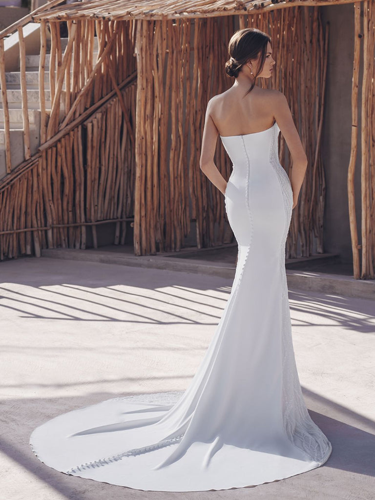 Radiate modern romance in this stretch georgette sheath wedding dress, SAMARA, with a structured, strapless bodice delicately ruched for a flattering fit. Geometric beaded lace adorning the side of the gown adds a hint of contemporary allure, making this ensemble a perfect choice for the bride seeking chic sophistication with a touch of sparkle.