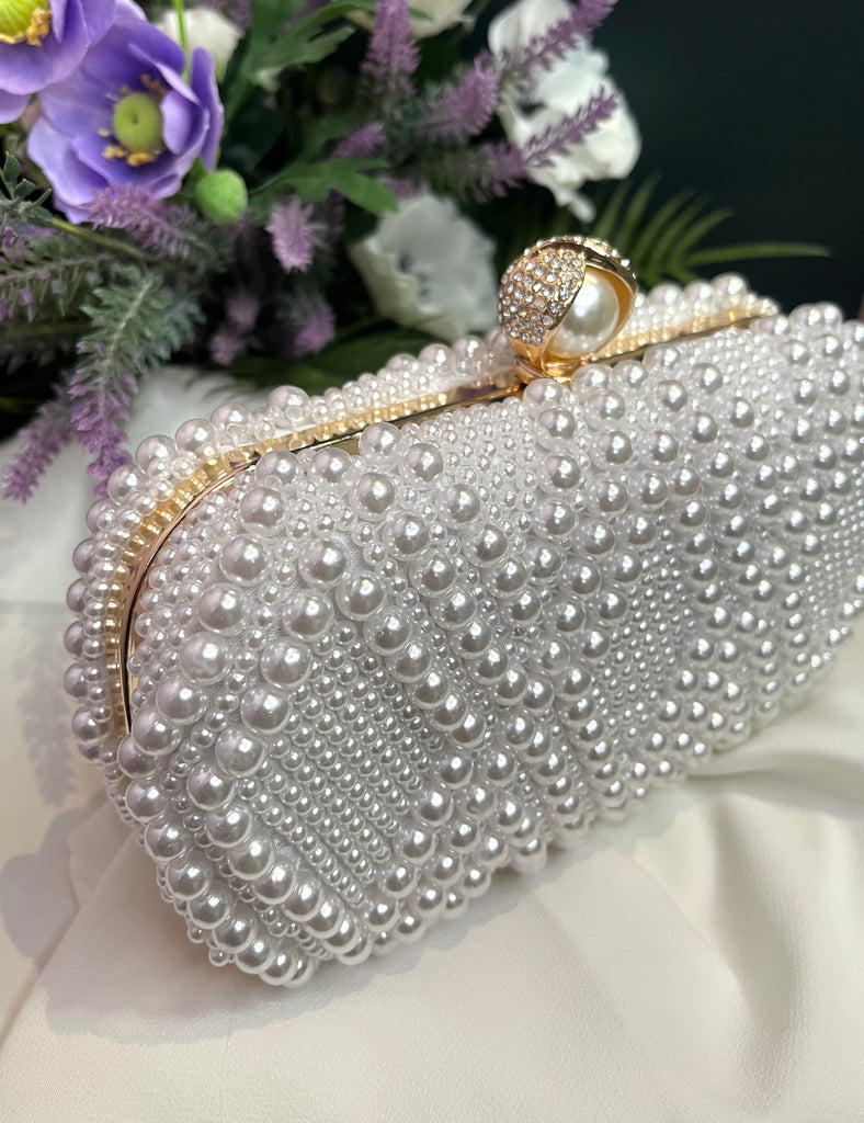 The pearl clutch bag with a detachable gold strap. The perfect size to fit your mobile phone and your lipstick!