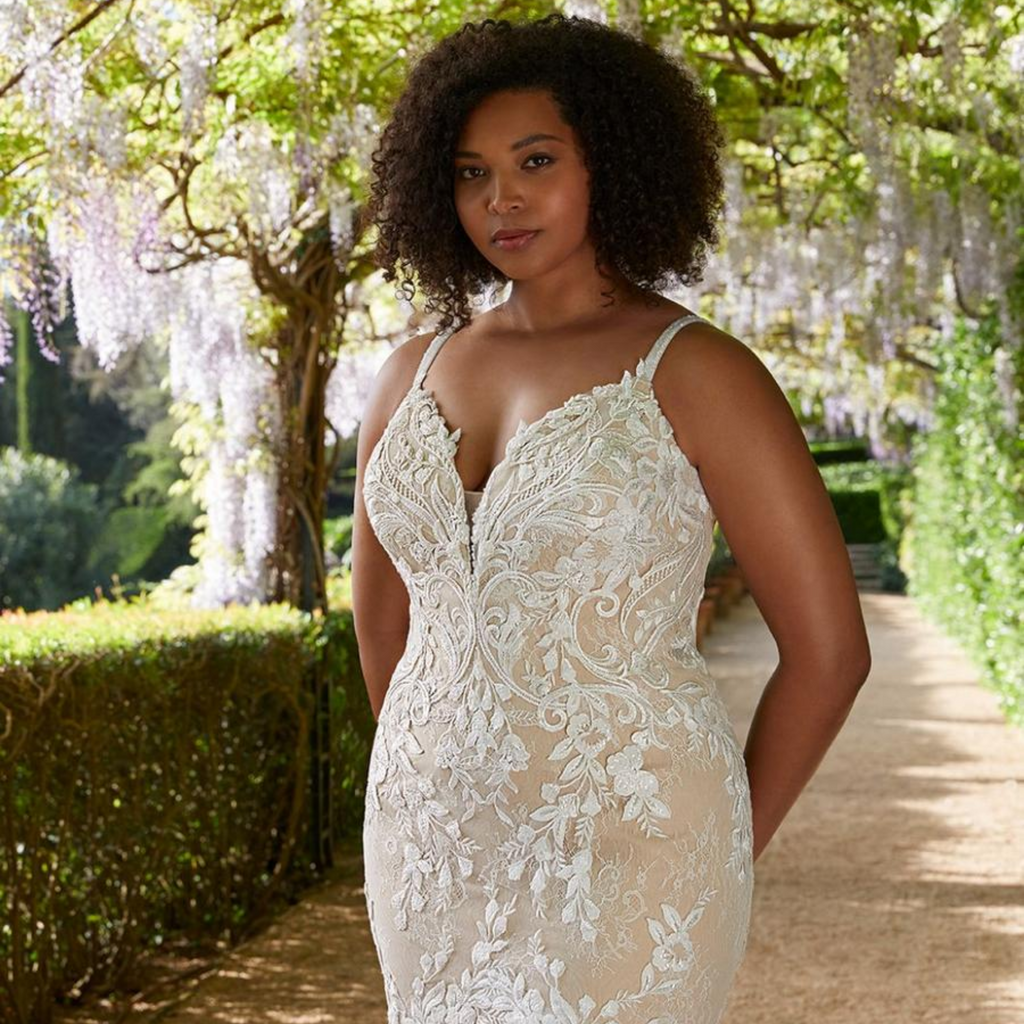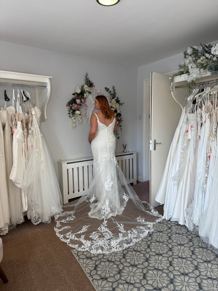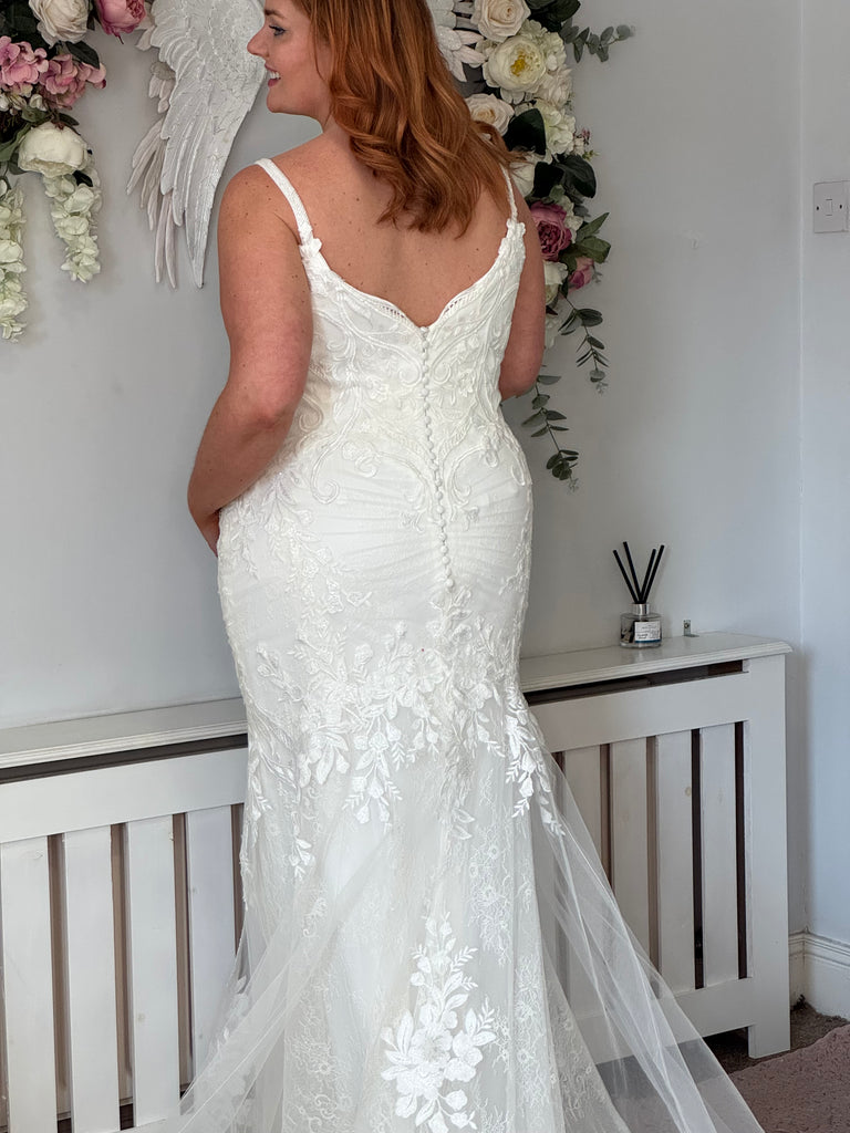 CALIE x ÉDITION is the epitome of sweet sophistication. This mermaid stunner features slim but supportive hand-beaded straps framing the sexy, plunging neckline. Sparking floral, baroque, and Chantilly lace are thoughtfully placed to beautifully curve around the body and contour the figure for the most flattering look. Covered buttons flow down to the stunning signature ÉLYSÉE sculpted train.
