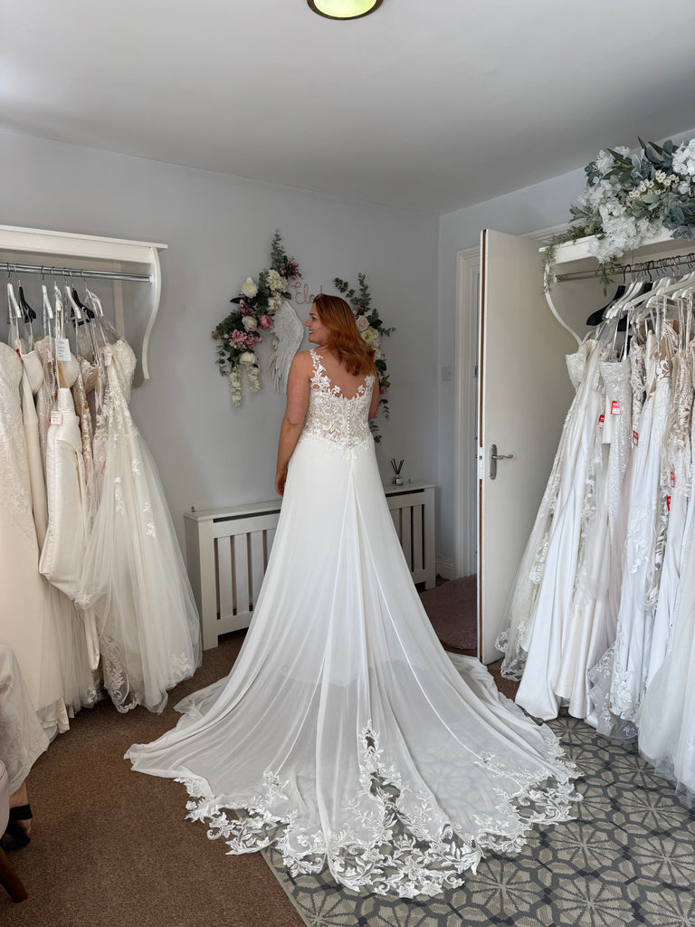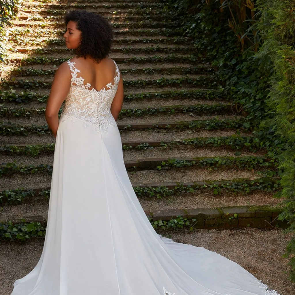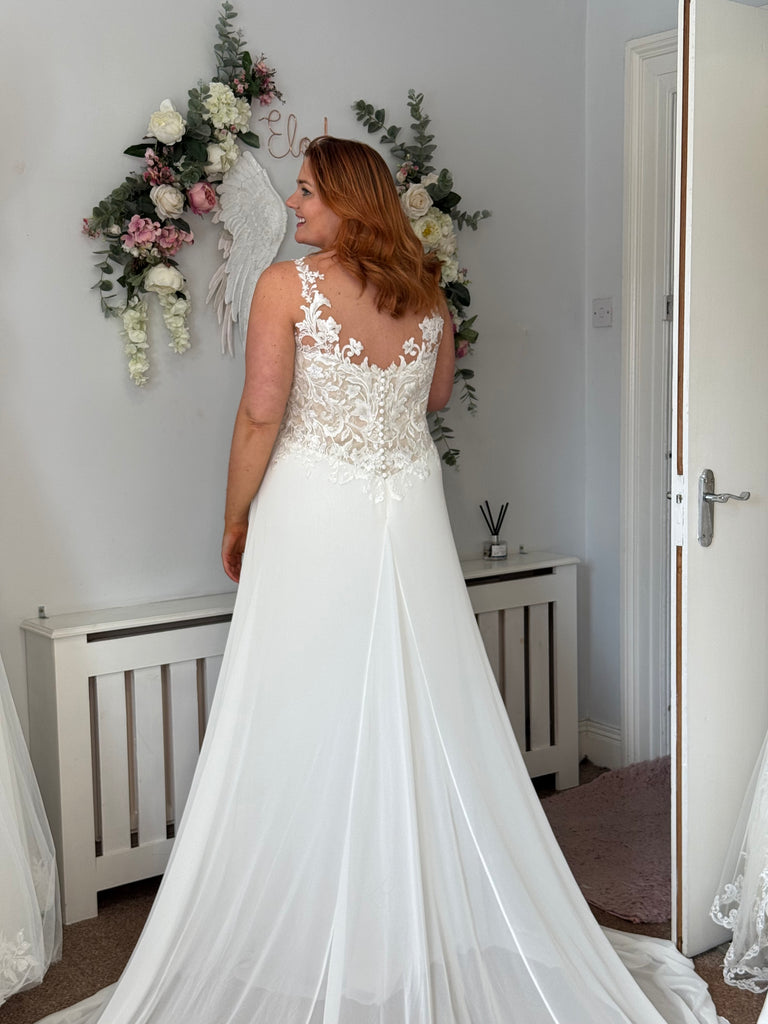CHARISSE x ÉDITION is an ethereal, romantic gown with a sparkling illusion lace bodice leading to a light, soft A-line tulle and chiffon skirt featuring a high slit for an extra dose of sexiness. Perfectly complementing the low illusion back is a gorgeous sculpted train with an exquisite lace cut-out detail for the dreamiest walk down the aisle.