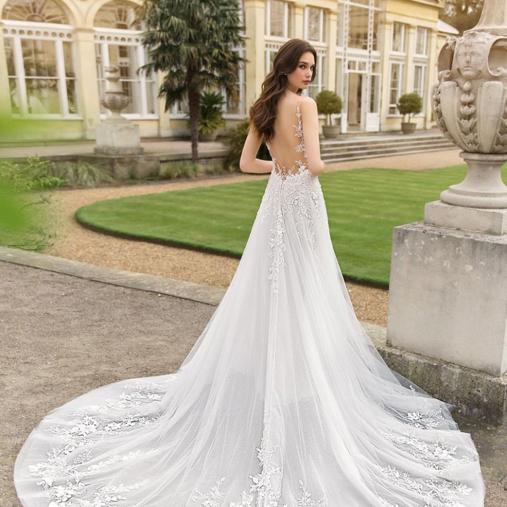 Opt for this stunning, full A-line silhouette with its feather-light volume for an ultra-romantic aisle style. Serenity features a plunging illusion V-neckline on an illusion corset bodice, open V-back and a long, lavish organza and tulle train with a shimmering layer underneath for added texture and subtle sparkle. Exquisite 3D beaded floral motifs and the customized thick dimensional floral embroidered lace from top to bottom complete its regal look.