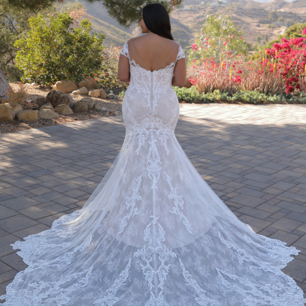 Hélène x Édition features sparkling baroque lace, hand beading along the portrait neckline, a sleek body contouring fit, and softly flared skirt. The detailing on this classic off-shoulder look is exquisitely delicate, with cleverly placed illusion tulle and a supportive high back. Finished with a unique, showstopping version of the signature ÉLYSÉE sculpted hem.