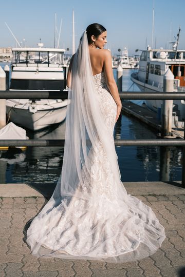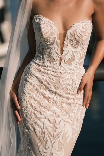 For the bride looking to make a statement, this fit and flare wedding dress is for you! A gorgeous all over laser cut lace is the focal point of the gown and is outlined with a glistening sequined embroidery. This figure flattering silhouette has a sexy plunging sweetheart neckline and is lined in stretch jersey to make you feel incredible on your big day.