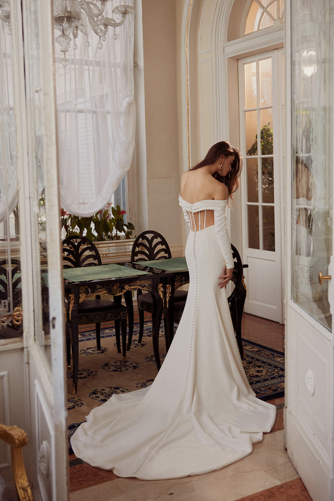 Crepe Fit and Flare Gown with Illusion Back with Exposed Boning