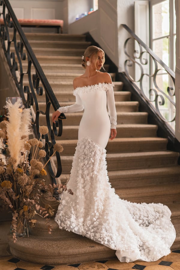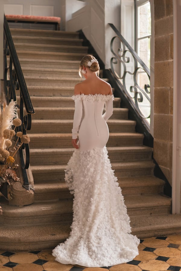 The Hanna mermaid dress is a win-win combination of minimalist style and romanticism. It is made of high-quality stretchy dense crepe that keeps its shape well and has a soft stretch lining. The straight neck with lowered long sleeves and the bottom of the skirt are decorated with voluminous chiffon frills, the petals of which add mobility to the image. The bottom of the skirt is lined with satin for extra volume and airiness and has six layers of tulle and a top layer of guipure. There are rows of functional buttons on the sleeves and back.