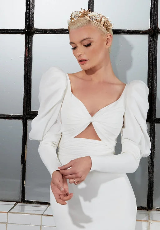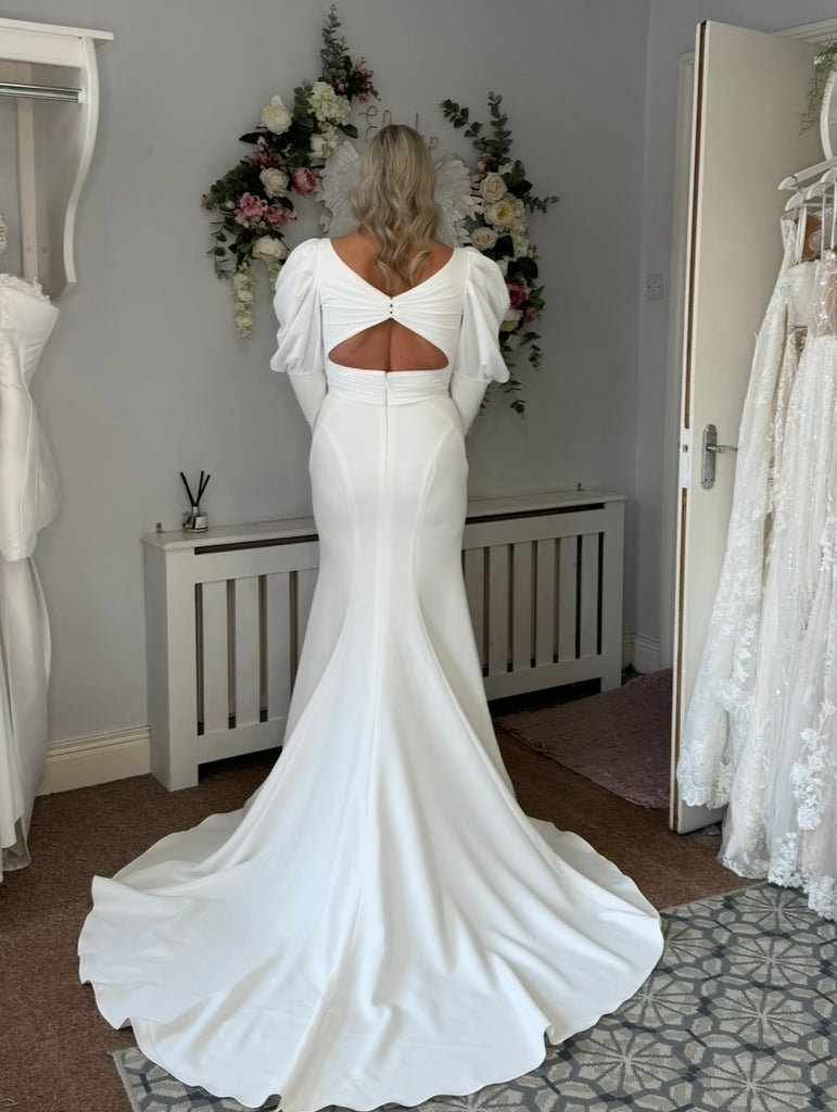FALLON is the perfect choice for modern brides who want to make a statement on their wedding day. The stylish twist neck and 80's inspired sleeves add a touch of glamour to the figure flattering lux crepe fabric. The dramatic key-hole back and train will ensure all eyes are on you as you walk down the aisle. The ultimate combination of fashion-forward design and timeless elegance, FALLON is the perfect choice for the perfect day.
