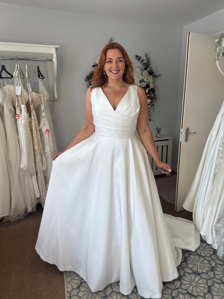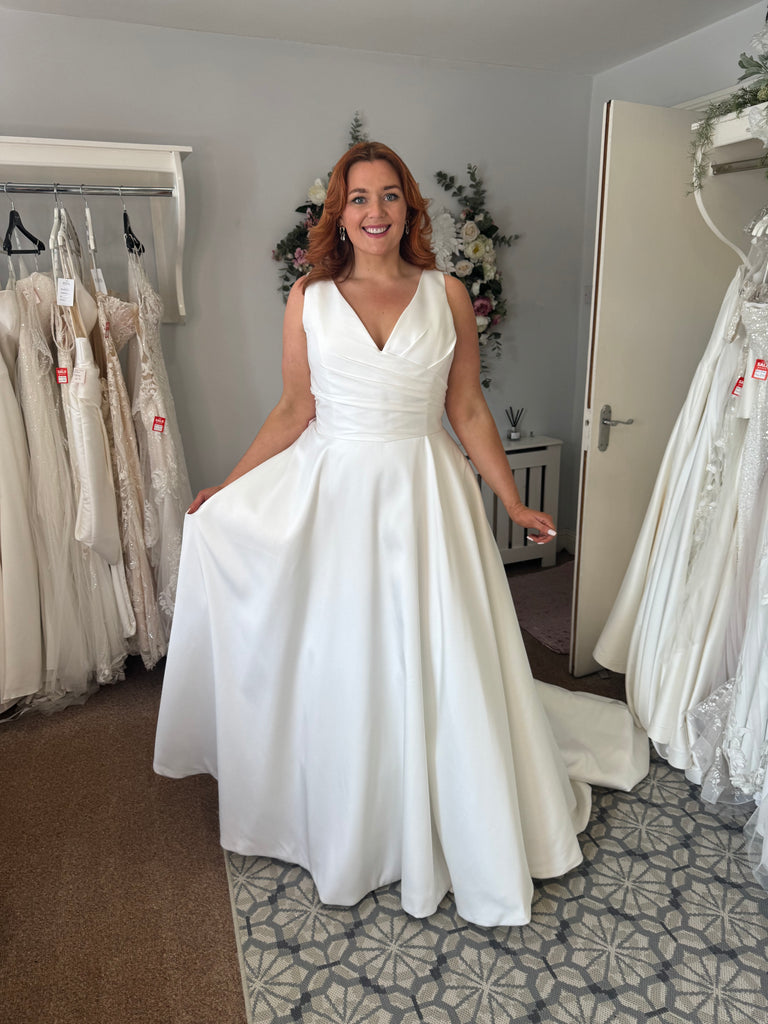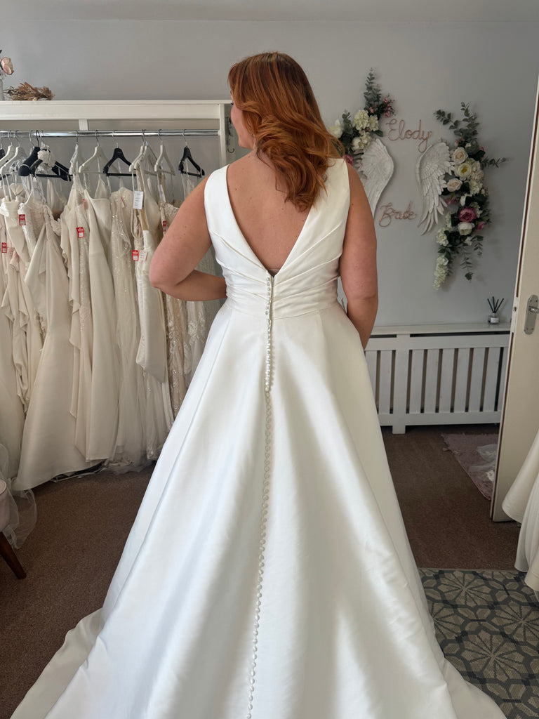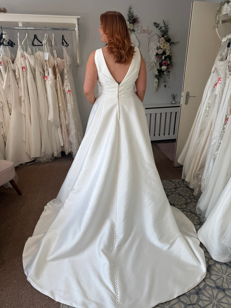 V neckline asymmetric, draped bodice, natural waist, Mikado ball gown with pockets with buttons to end of chapel length train.