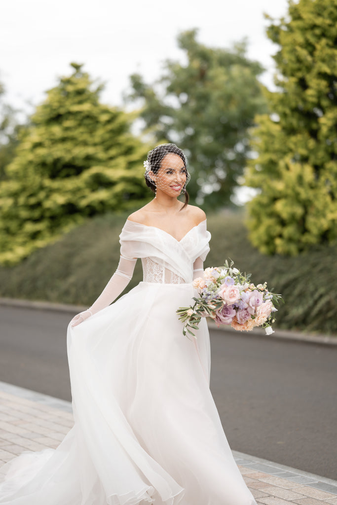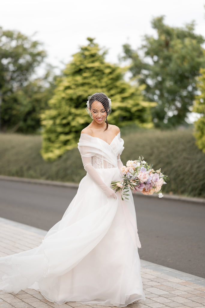 Organza A-line with lightly pleated off the shoulder neckline. Sheer bodice features a Chantilly lace underlay and skirt detailed with subtle box pleats. Finished with organza covered buttons down back bodice and a chapel length train.