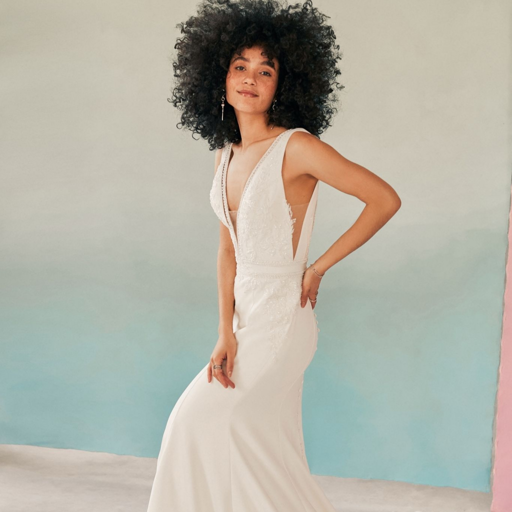 Suspended on a fine band of illusion net, beaded edging perfectly accompanies the tonal beadwork across the bodice of this crepe gown.