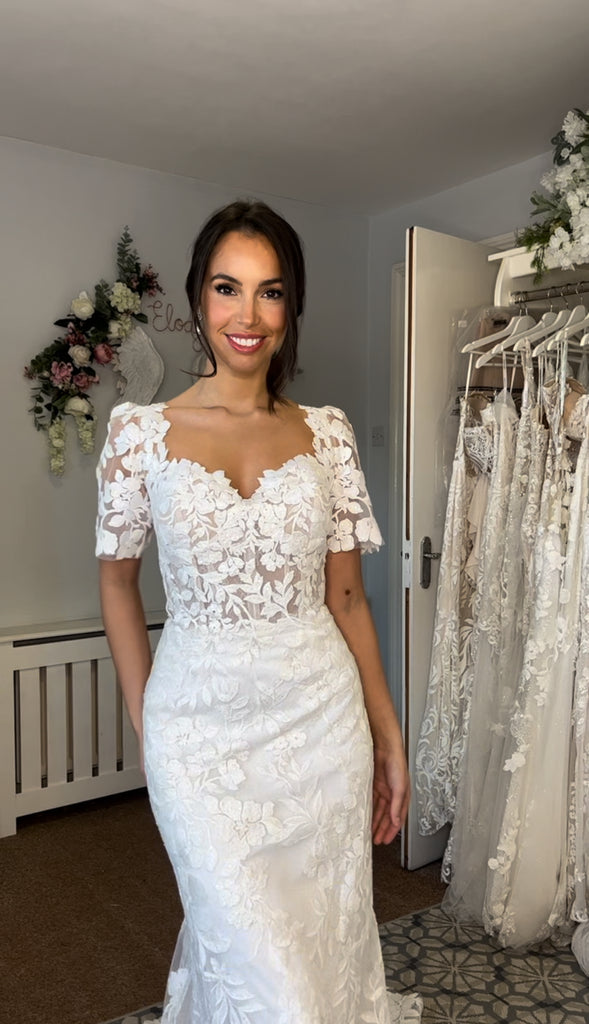 Sequined appliques shimmer along the sweet short sleeves and Chantilly lace of this fit and flare sheath.