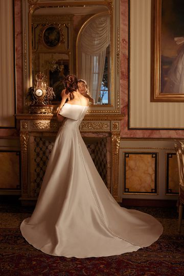 A-Line Wedding Dress with Off The Shoulder Cuff and Skirt Slit.