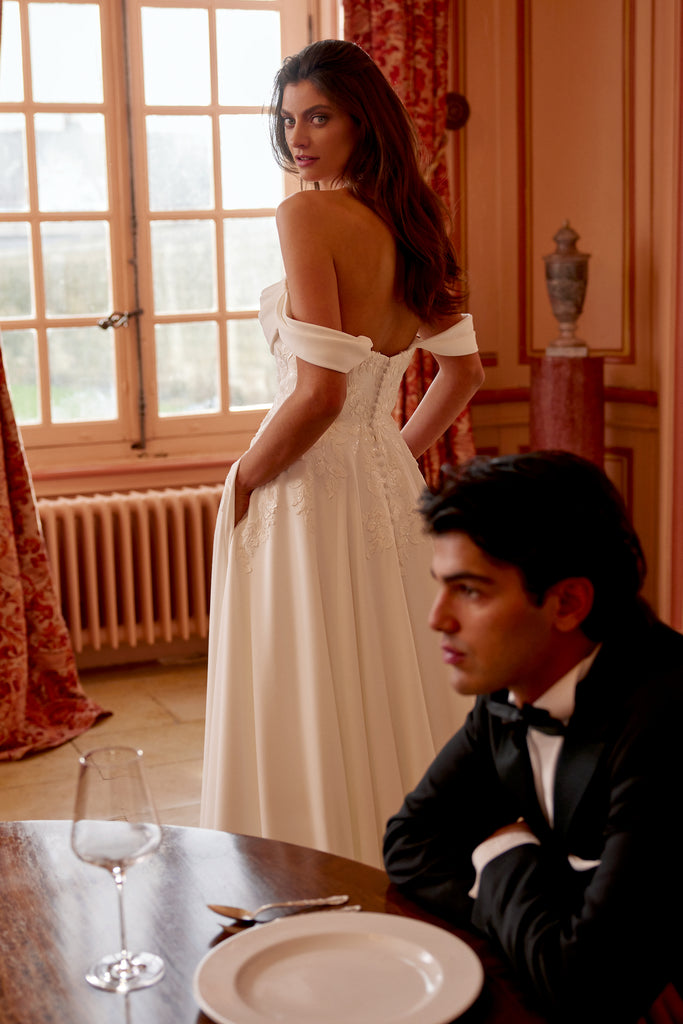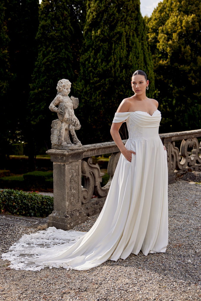 Crepe A-line gown with sweetheart neckline and cowl detail, detachable off-the-shoulder straps included and princess seams down the front of bodice and skirt. This beautiful gown features peek-a-boo sequin lace at its sweetheart neckline. Adorned with tonal sequin lace along sides of bodice, back of bodice and trickling down sides of skirt, finished with a lace train.