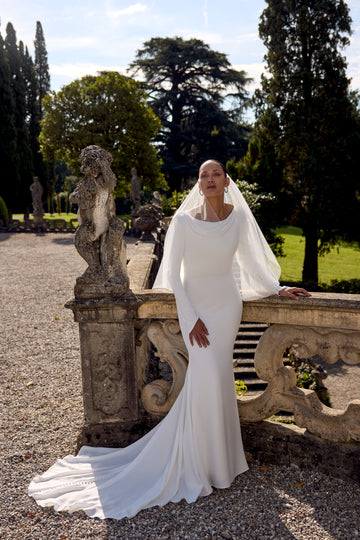 Clean stretch crepe fit and flare gown with high cowl neckline. Kathleen features long gauntlet style sleeves with pearl buttons up the forearm, a structured corset built into its bodice and a low V-back that is accented by a basque waistline. Finished with buttons from back waistline to end of chapel length train.